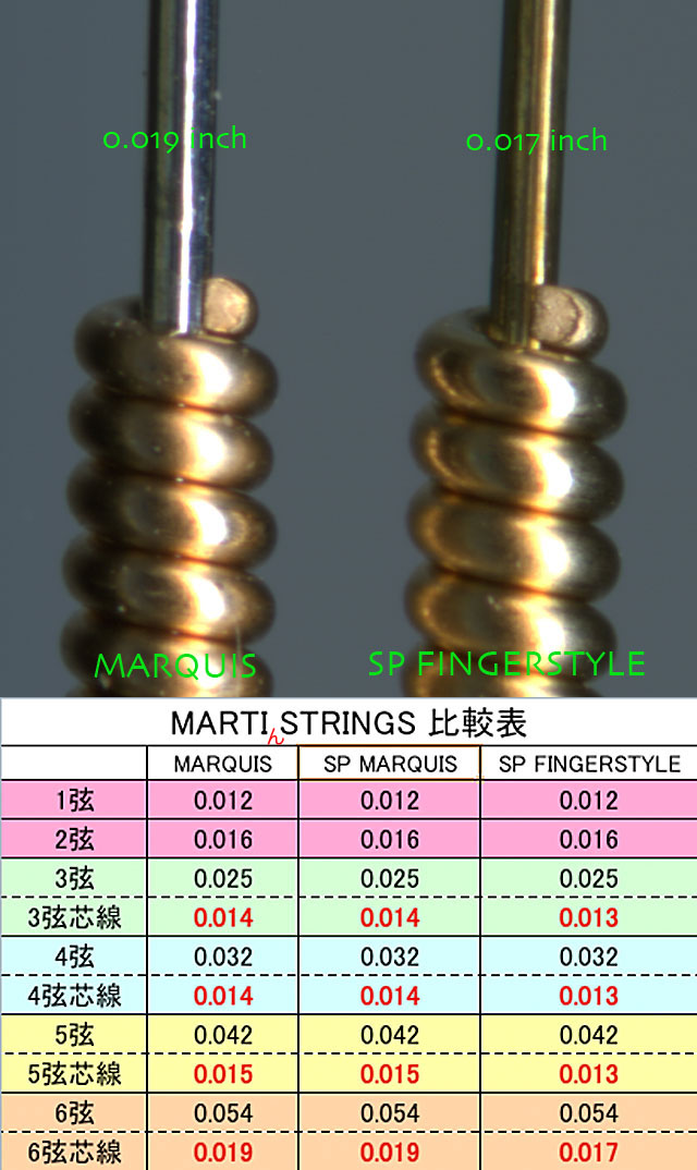 さて、「SP FINGERSTYLE」の手触りが妙に柔らかいのが気になったが、巻き弦の太さは一緒だ。とすると芯線の太さが違うのかもしれない。そう考えて測ってみるとやはりそうだった。表の赤字を見ると分かるように、他の弦に比べると微妙に細い。写真は6弦だが、右の弦の芯線の方がほんのわずかだが、細いのが分かるだろうか。後は実際にMerrillに張ってみて音出してチェックだね。