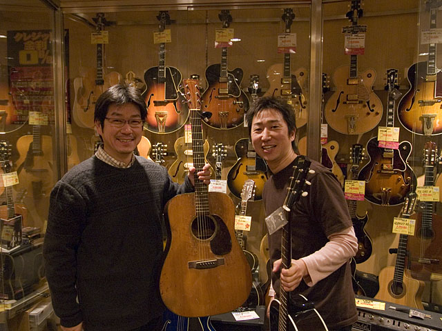 イシバシのアコギ売り場に入ると、奥で怪しげな二人が「アアデモナイ、コウデモナイ」と楽器を物色中だ。う〜ん、コレはまずいところに遭遇したか、と身構えて奥に入っていくと何と見慣れた顔が二つ揃っているではないか。ジプシーギターの達人有田純弘氏と、もう一人はウエキ弦太氏だった。ウエキ氏は、以前tassiの旧友d.kのライヴで一緒になったこともあるギタリストだ。いやいや懐かしいなあと3人で盛り上がる。そんなこんなで、アコギ売り場の奥は危ないオヤジたちに占拠され、店員もちょっと及び腰の対応。他のお客の入る隙をも与えず、この時間イシバシは商売上がったりだったのではないかと、深〜く反省してます。
