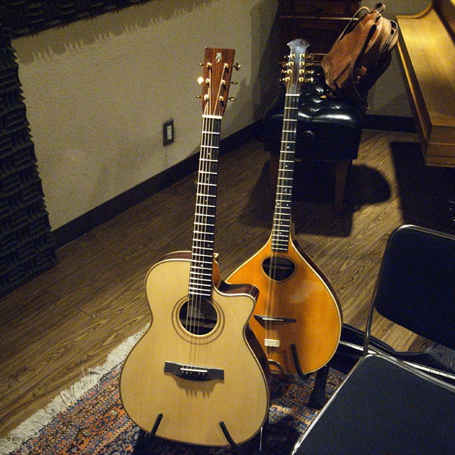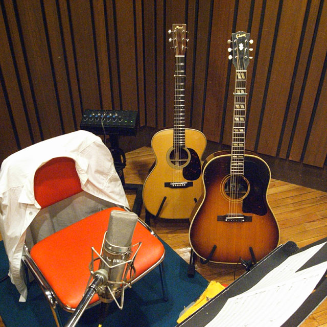 ギターのパートはほぼ前のテイクをコピーしたものだった。いくら自分が弾いたものとはいえ、こうやって譜面に書かれると、ナカナカ戸惑うものである。前回tassiはアコギのパート全てと、マンドリンまでダビングしたが、本日はギターのフレーズ・パートのみ。ギターはカスタムライトを張ったMerrill OM28。充実した中域と倍音豊かな高域がこのギターの特徴だ。カスタムライトはちょっと細い弦なので、ビブラートなどの表情はつけやすい。しかしいつものライトゲージのつもりで強く弾くと飽和状態になるので、タッチのコントロールが要求される。