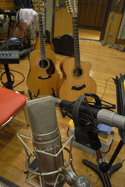 ちょっときれいめなアルペジオとストロークということで、MARTIN D-45とTAYLORの12弦で作業開始。マーチンを使うならと、先日手に入れたNEUMANN M582を立てるが、やはり中高域にクセがあり1本ではちょっと難しそう。ということでNEUMANN U67も立ててもらい、TDの時にバランスを取ってもらうことにした。逆にオケが厚くて埋もれそうなときには、M582でも十分本領発揮するだろうと思った。スタジオでは基本的にマーチンのDタイプは使わないtassiだが、本日は上品で暖かいサウンドが演出できたようだ。