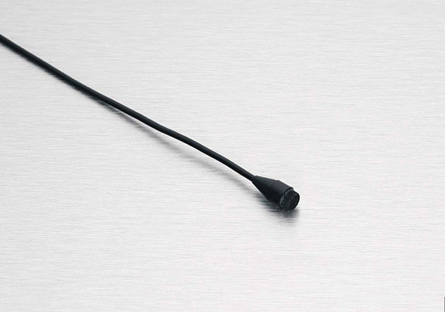 赤いマイクスタンドの先から細く黒いケーブルが伸びているのが分かると思う。その先のちょっと膨らんでいるのが今回のマイクである。