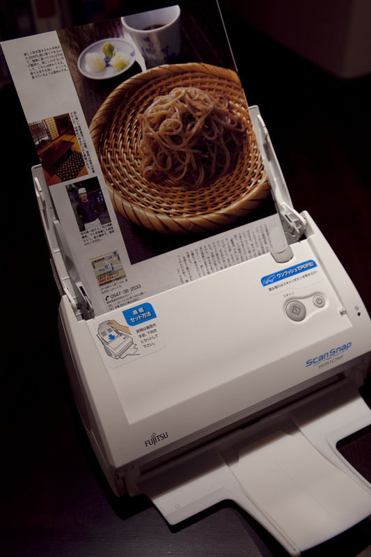 年賀状はもとより名刺や古い紙焼きの写真、雑誌の切り抜きなど、あらゆる書類をスキャンした結果、本棚はスッキリと片付いてしまった。あの雑誌のあそこに載っていた蕎麦屋、なんていう店だったかなあ。なんていう時は、外出先でもササッとMacBookを開き、「iPhoto」を立ち上げればスキャンした写真がパッと出てくるのだ。もちろんiPodでもOKだ。