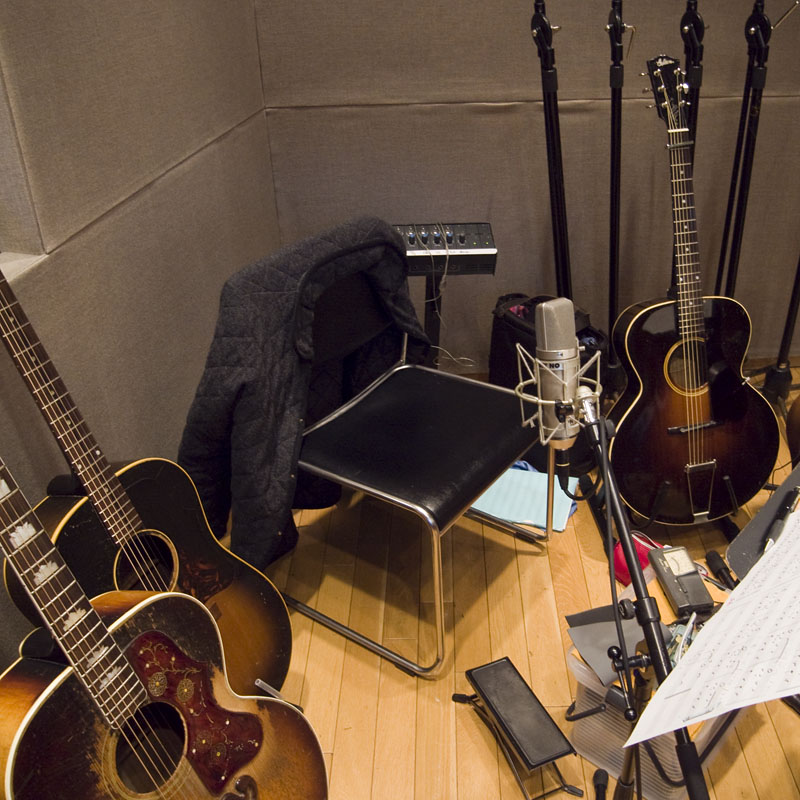 もう一人のギタリスト伊丹氏と相談の上、楽器を選んで持ってきてください。とのことで、ブルージーな感じを出すために、GIBSON L-4、GIBSON J-200、GIBSON J-45、そしておまけにNATIONALを狭いブースの中に持ち込む。