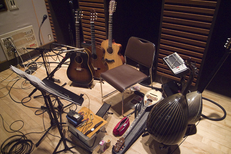 今日はメンバーが多かったので、まずは千代氏と同じブースにて、二人でギターのベーシックを録る。そして皆さんがお帰りになった後で、一人フロアにカンテレをセッティングし、時間をかけてダビング作業だ。